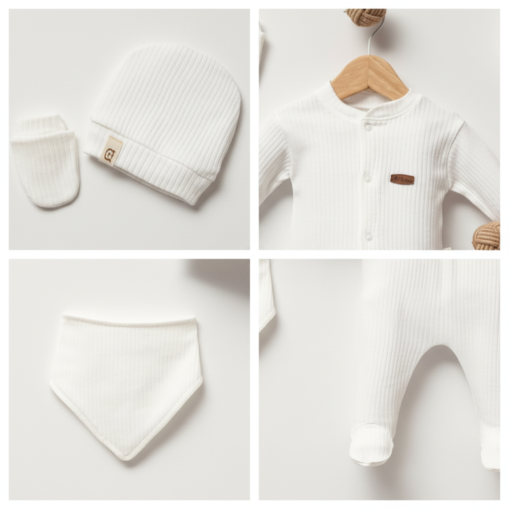 Yeni doğan bebekler için özel olarak tasarlanmış set; uzun kollu üst, pantolon, şapka, önlük ve eldivenden oluşmaktadır. On farklı renk seçeneği ile sunulan bu model, bebeğinizin tarzına uygun alternatifler sunar.