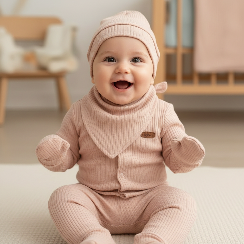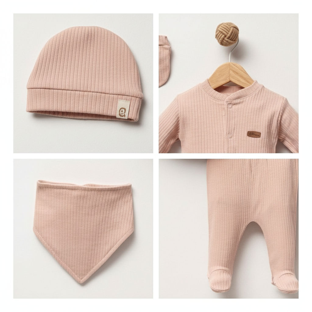 Yeni doğan bebekler için özel olarak tasarlanmış set; uzun kollu üst, pantolon, şapka, önlük ve eldivenden oluşmaktadır. On farklı renk seçeneği ile sunulan bu model, bebeğinizin tarzına uygun alternatifler sunar.