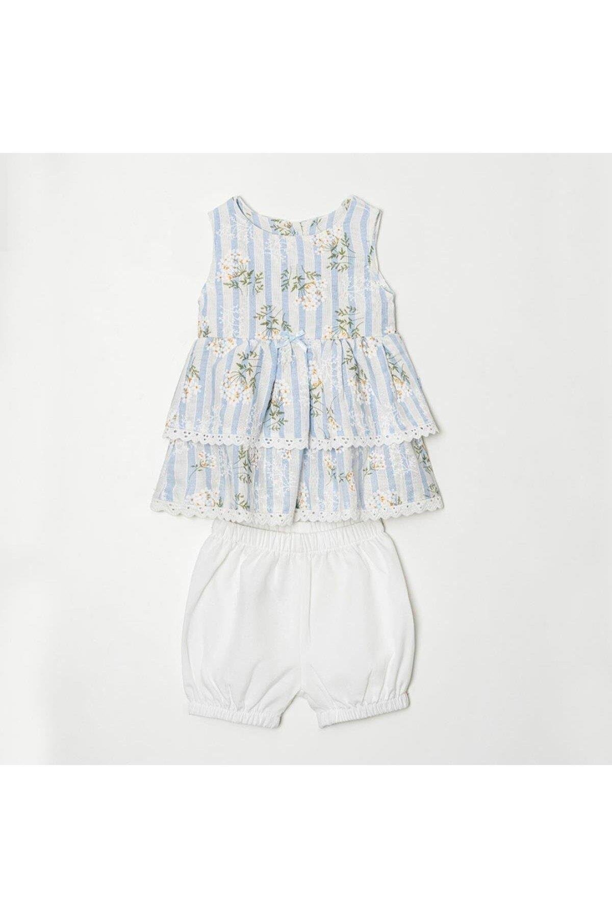Kız Bebek 6-24 Ay Fiyonklu Takım Elbise 2'li - Mavi Yıkama Talimatı: Maksimum 30 derecede Tersten yıkayınız.; Ağartıcı kullanmayınız.; Kullanmadan önce yıkayınız ve ateşten uzak tutunuz.; Ütüleme Talimatı: Tersten ütüleyiniz.; Baskıları ütülemeyiniz.
