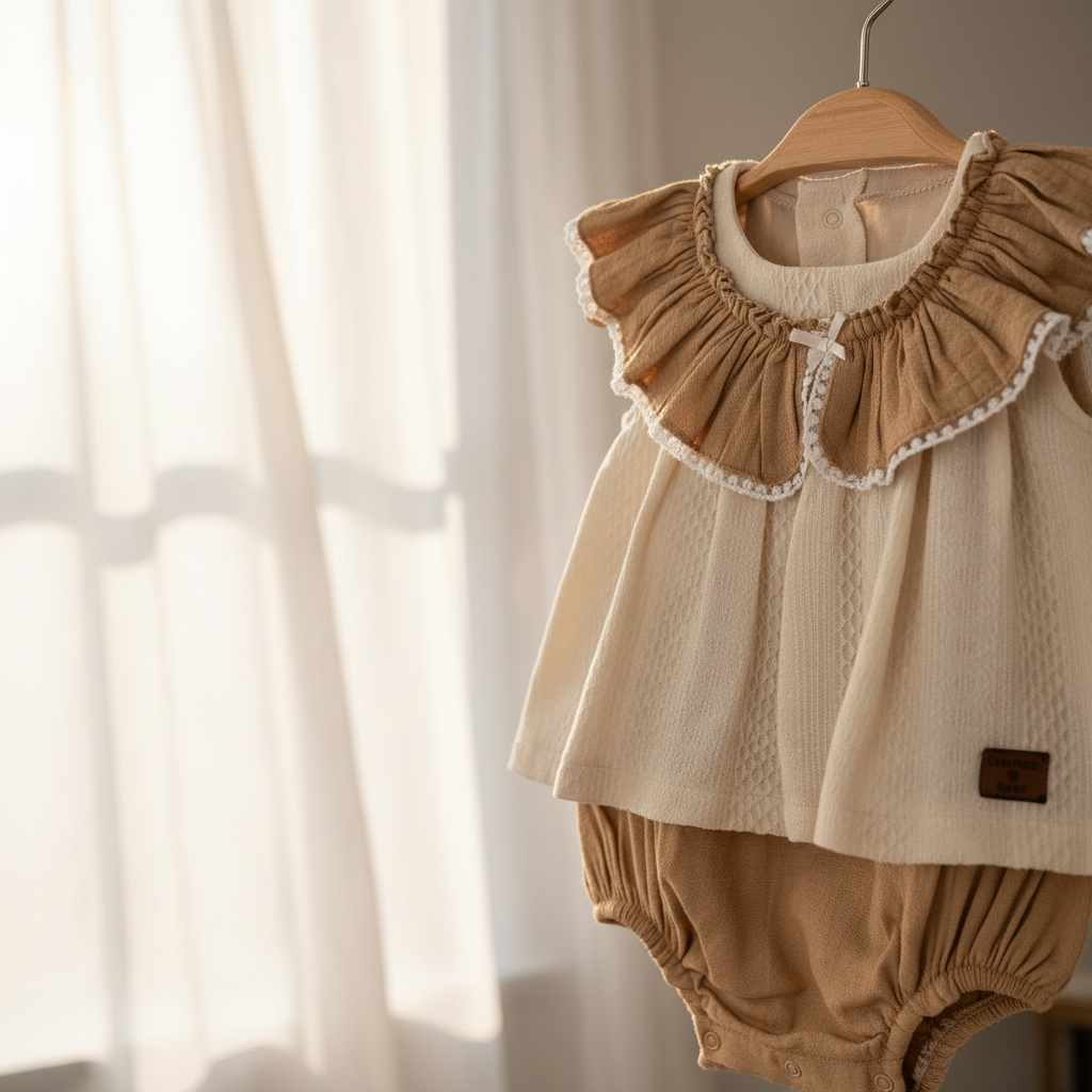 Kız Bebek Çocuk Organik Pamuklu Fırfır Yaka Sıfır Kol Çıtçıtlı Zıbın (URU0008-KAHVERENGİ-3)