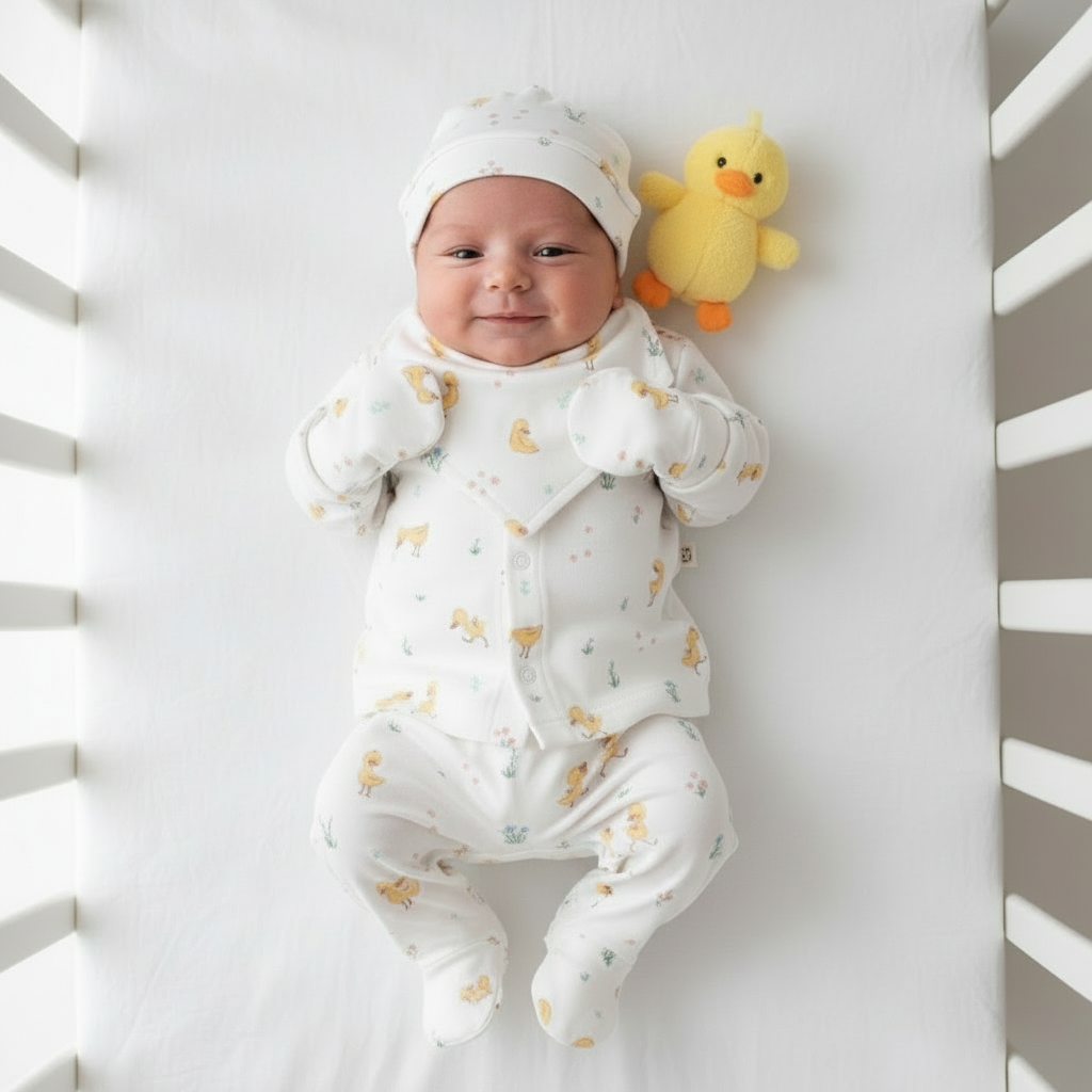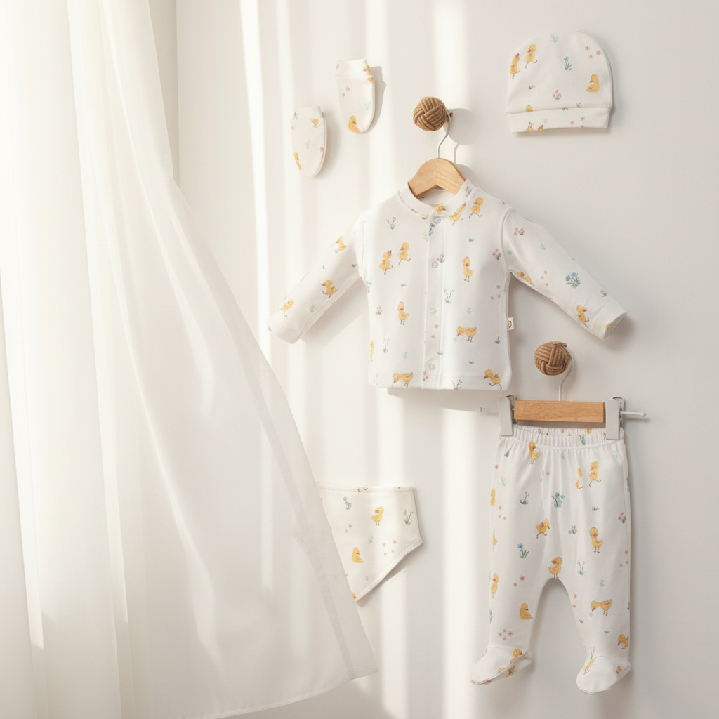 Ürünya Ördek Desenli 5'li Set, bebeğinizin hassas tenine uyumlu %100 pamuk ipliğiyle üretilmiştir. Cildin nefes almasını sağlayan yapısı ve sevimli tasarımıyla hastane çıkışında ebeveynlerin en favori tercihlerinden biridir.