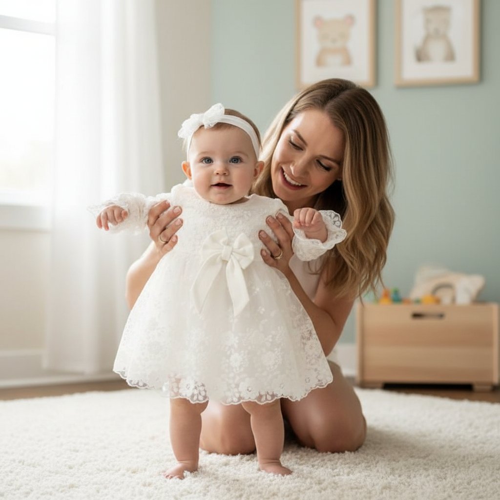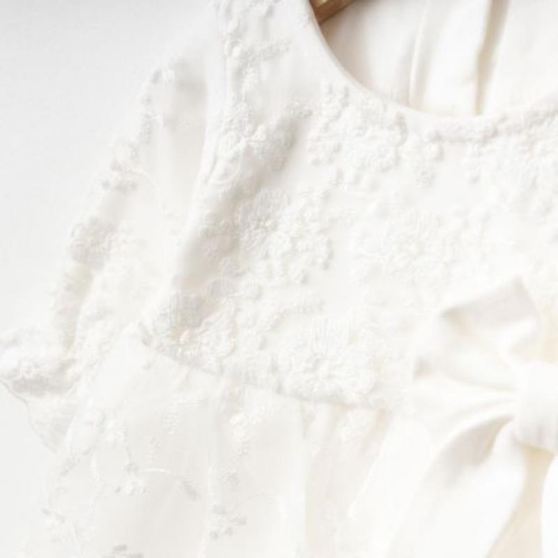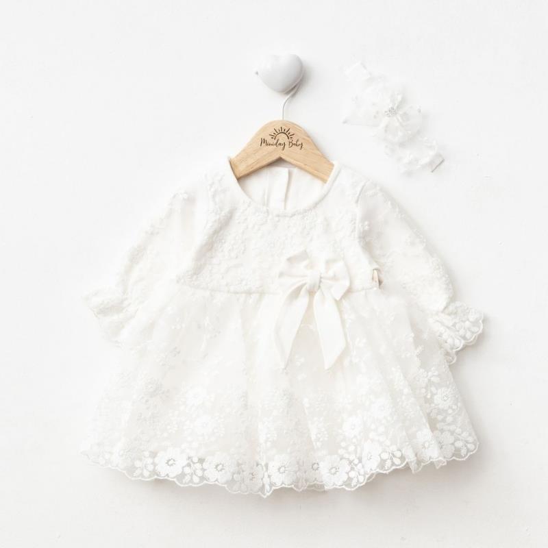 Bu beyaz tüllü kız bebek elbisesi, 3–12 ay arası minikler için hem şık hem de konforlu bir tasarım sunar.
