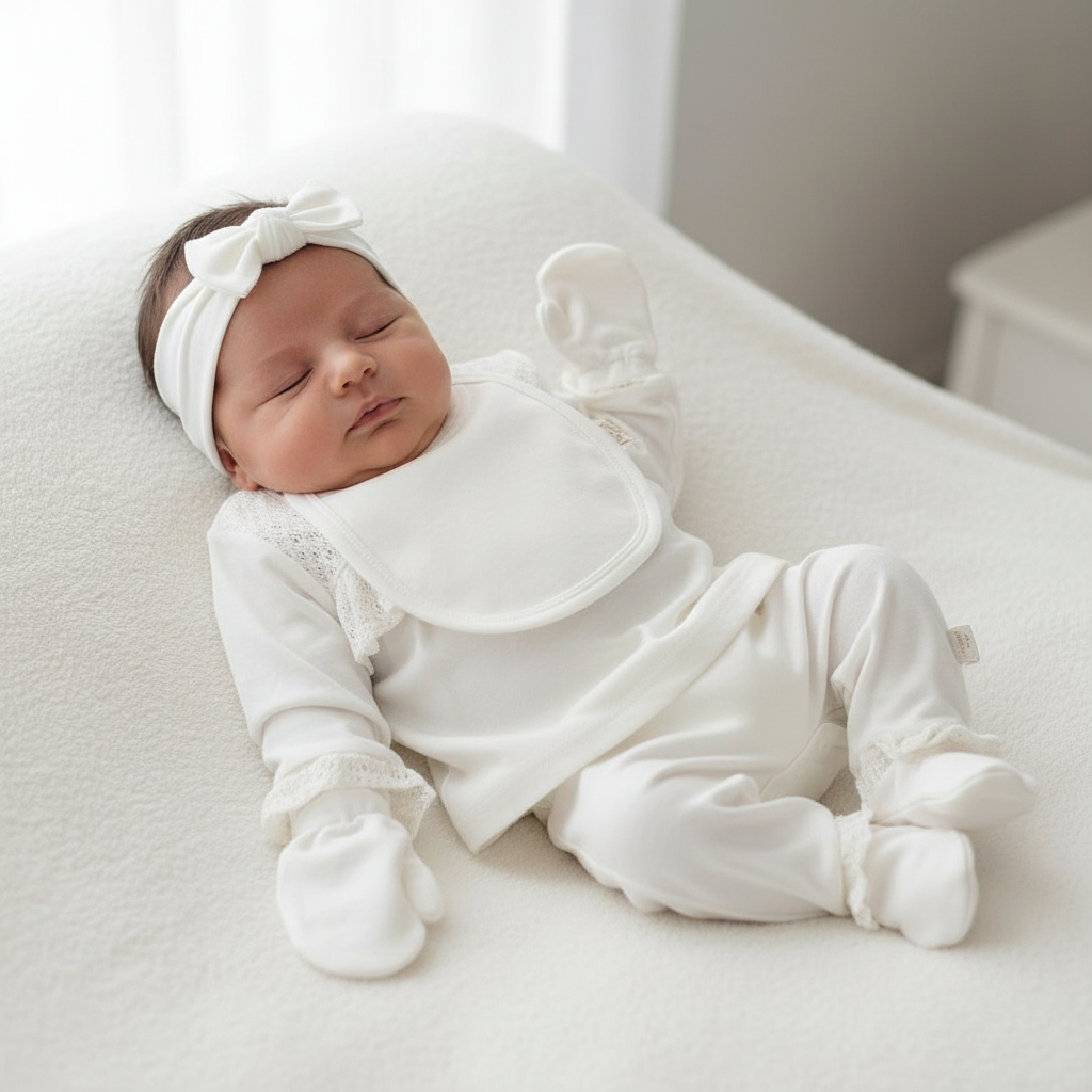 Ürünya’nın organik serisinden çıkan bu özel set, estetik detayları en yüksek sağlık standartlarıyla birleştiriyor. Hassas bebek cildi için özel olarak dokunan işlemeli kumaşı, terletme yapmayan yapısı ve zarif fırfır detaylarıyla hem hastane çıkışında hem de özel günlerde bebeğinizin yıldız gibi parlamasını sağlar.