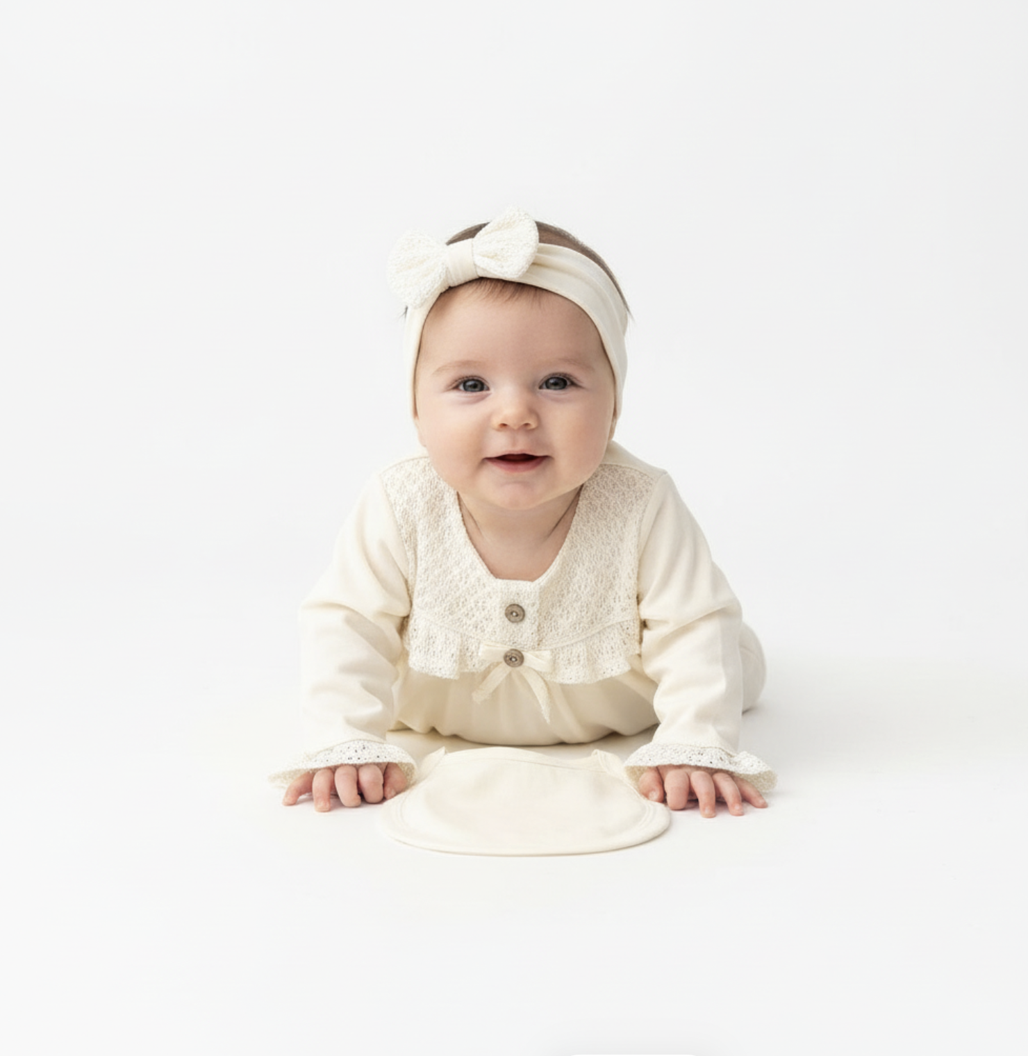 0 ila 6 ay arası kız bebekler için özel olarak tasarlanmış bu set; uzun kollu düğmeli üst, pantolon, bere, eldiven ve önlükten oluşmaktadır. Dört farklı renk seçeneği ile sunulan bu model, bebeğinizin tarzına uygun alternatifler sunar.