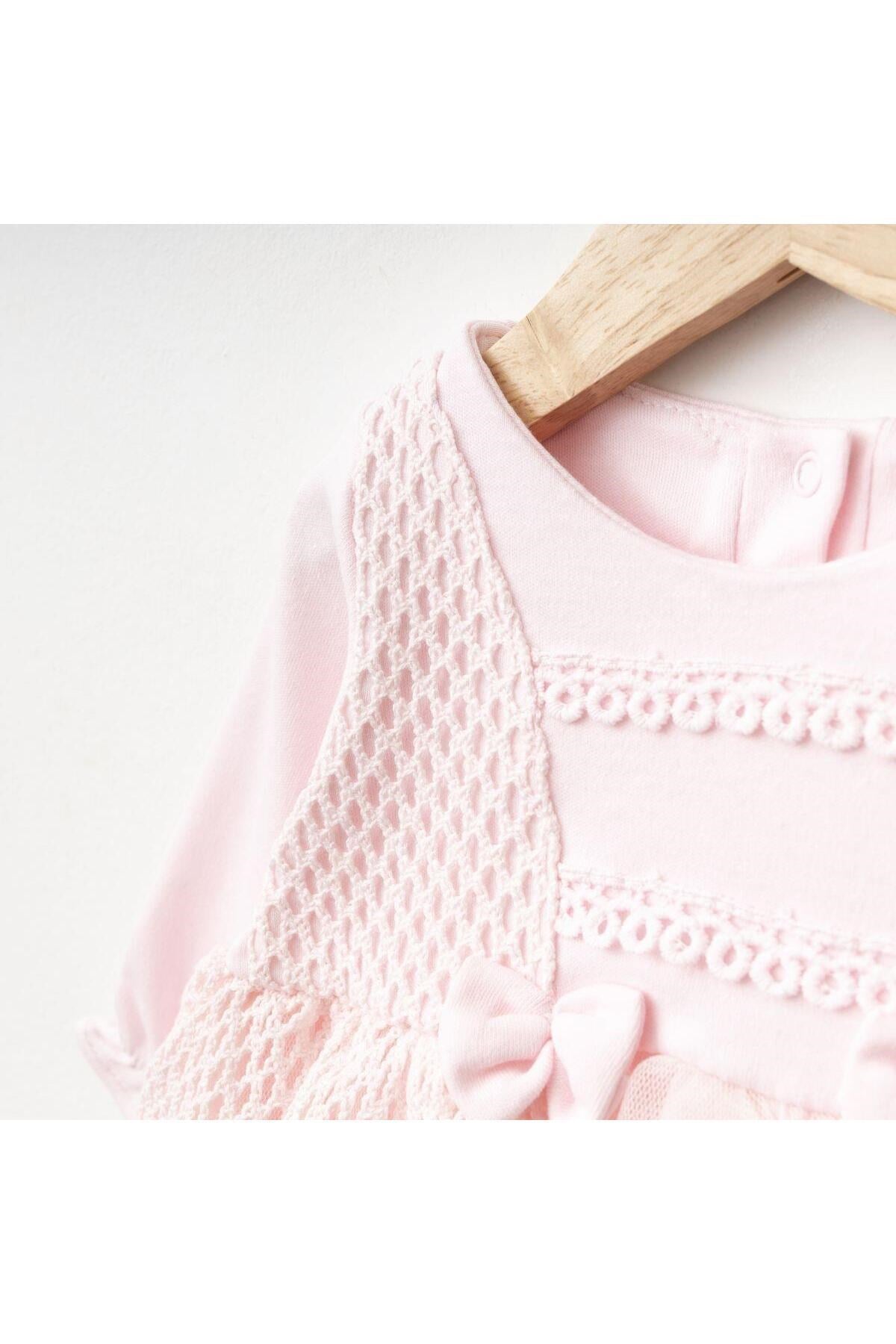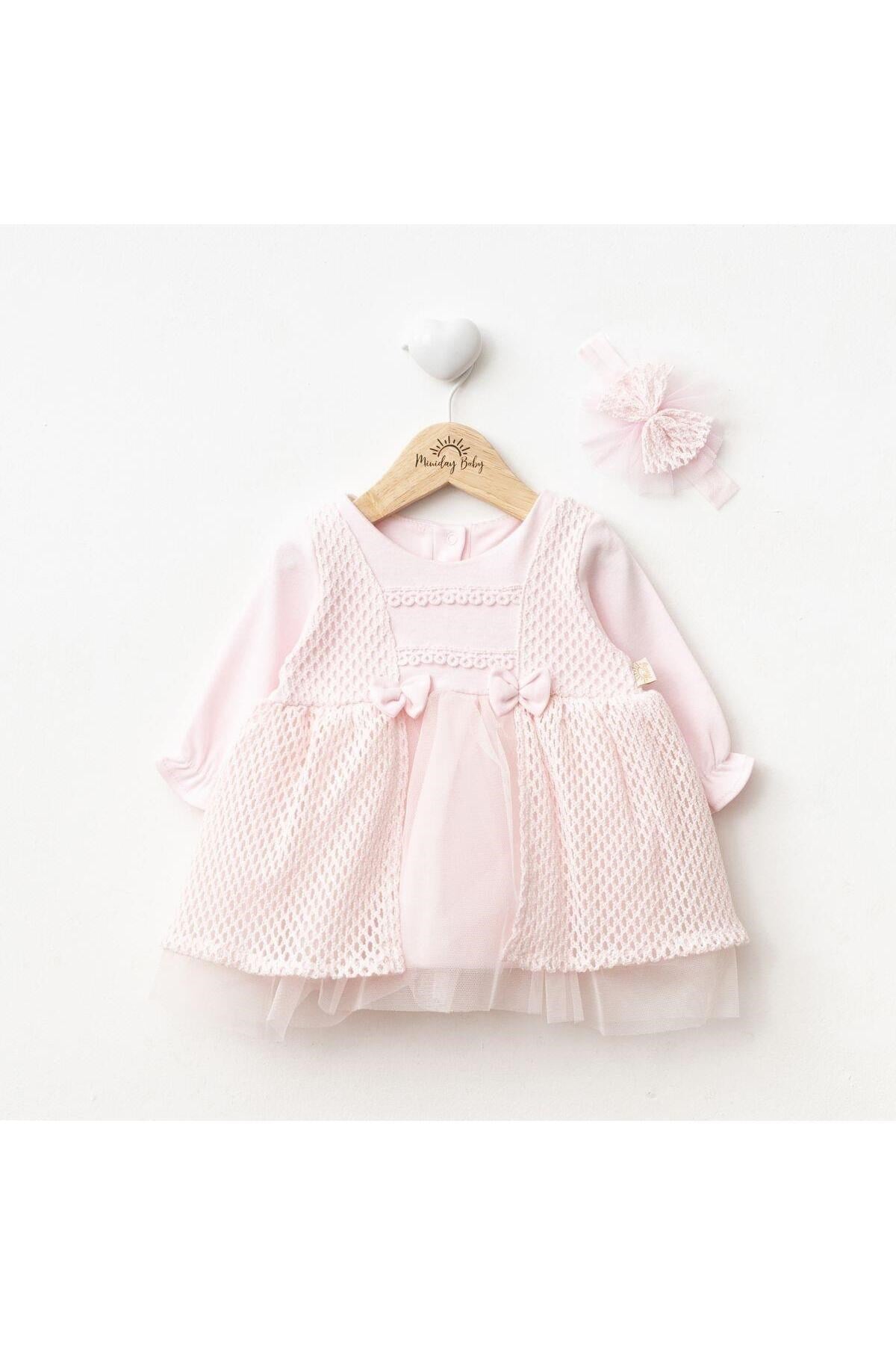 3 ila 12 ay arası kız bebekler için özel olarak tasarlanmış elbise, uzun kolludur.; Dört farklı renk seçeneği ile sunulan bu model, bebeğinizin tarzına uygun alternatifler sunar.; Ürün, bebeğinizin hassas cildini korumak amacıyla sağlığa zararsız kumaş, boya, iplik ve aksesuarlar kullanılarak üretilmiştir.; Uzun ömürlü kullanım için yıkama talimatlarına dikkatle uymanız tavsiye edilir.