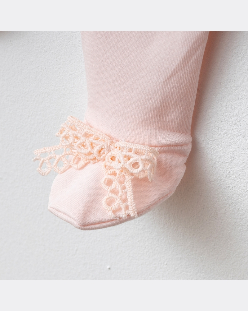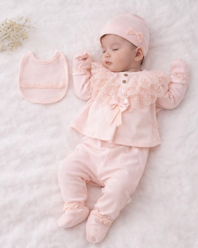 Zarif dantel ve fiyonk detayları ile süslenmiş bu özel set, hem hastane çıkışı hem de ilk günler için ideal bir tercihtir. Şık tasarımı sayesinde fotoğraf çekimleri ve hediye alternatifi olarak da öne çıkar.