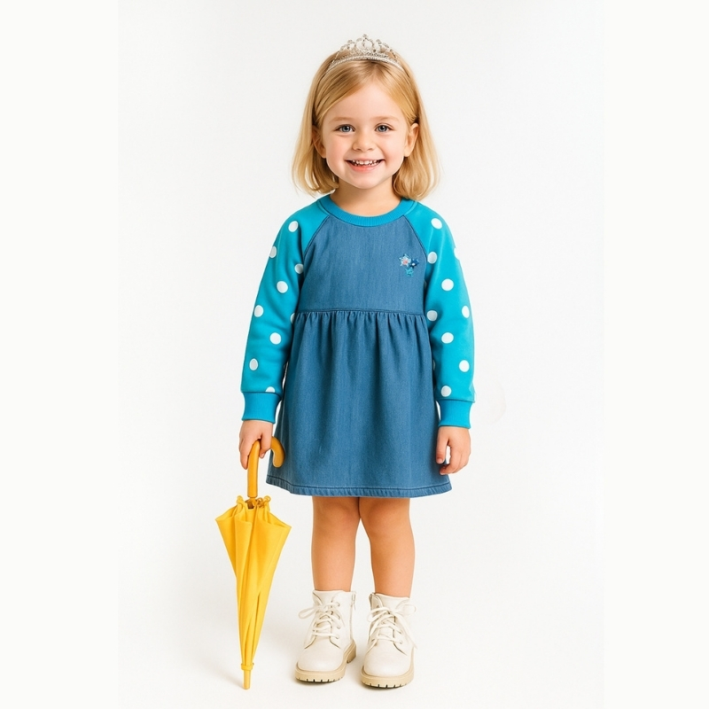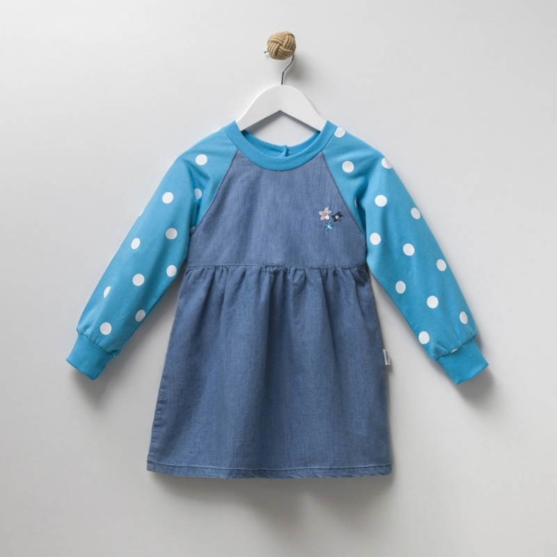Kontrast renkli puantiyeli kol detayları ve sade elbise kesimi ile modern ve sevimli bir görünüm sunar. Mevsim geçişlerinde ve serin havalarda uzun kollu yapısı ile rahatlıkla tercih edilebilir. Günlük kombinlerin yanı sıra okul, doğum günü ve özel günlerde de şık bir alternatiftir.